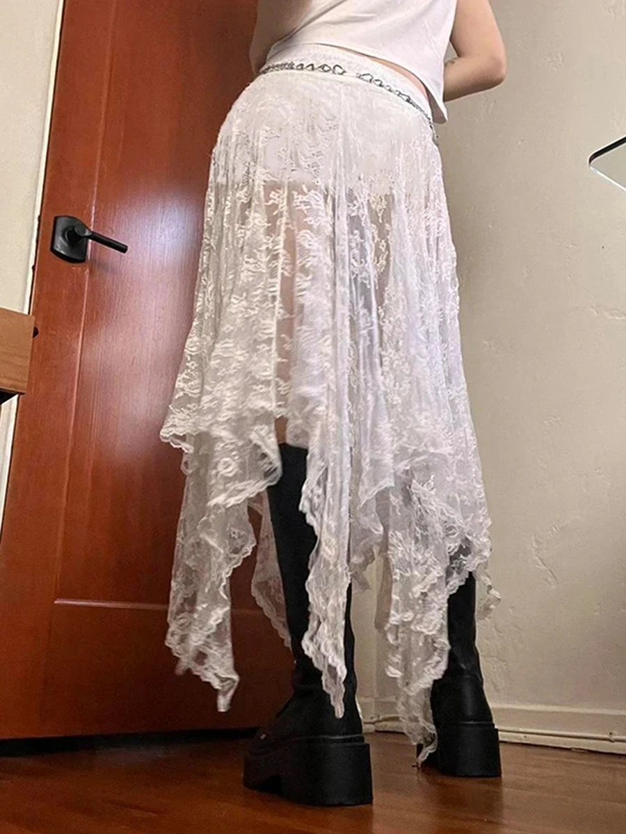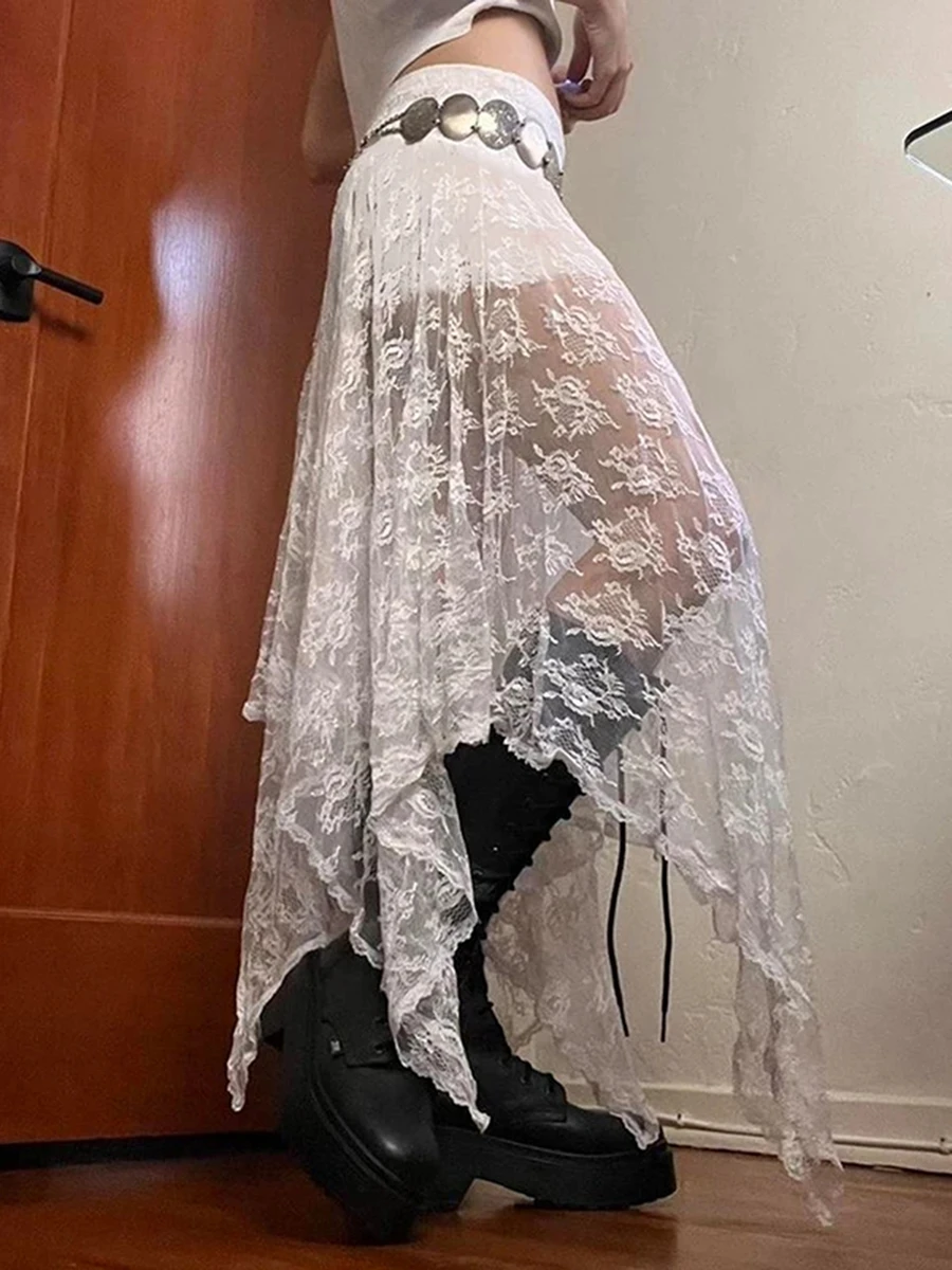 Women Elastic Lace Skirt Casual Summer Sheer Irregular A-Line Skirt for Beach Vacation Club Streetwear Aesthetic Clothes